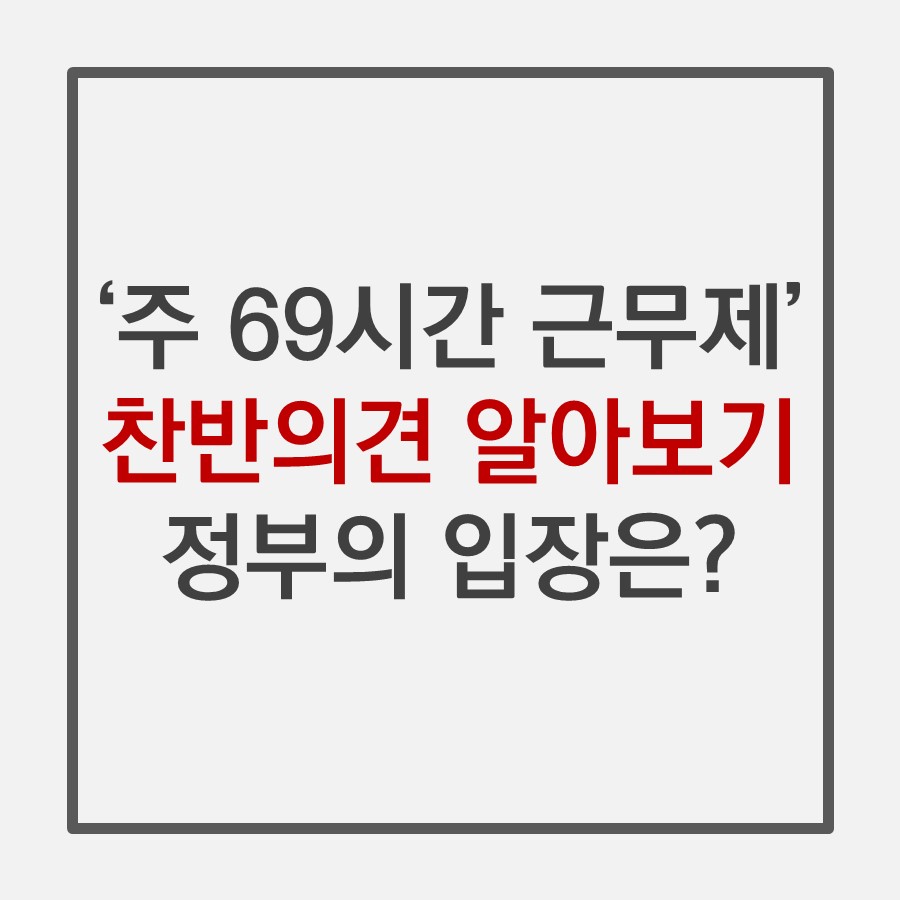 주 69시간 근무제는 정부가 발표한 근로시간 개편안을 대체하는 용어로 '69시간제'라고도 쓰입니다. 서론에서 말했듯이 주 최대 52시간인 근로 시간을 최대 주 69시간으로 늘리는 대신에 52시간에서 초과 근무한 시간만큼 다른 주의 근로 시간을 줄이거나 휴가로 보상하는 제도입니다. 쉽게 말해 큰 프로젝트가 있는 주는 힘들게 야근하고 프로젝트가 끝나는 다음 주는 푹 쉬며 충전하자는 취지의 제도입니다. 기존의 주 52시간 제도는 업무시간의 총량이 '주' 단위로 묶여 있기 때문에 업무량에 따른 탄력적인 근무가 불가능한데 이를 개편하여 근로 시간을 '월'이나 '연' 단위로 계산하여 근로자가 유연하게 근무할 수 있도록 하는 제도입니다. 탄력적인 근무시간으로 생산성을 올릴 수 있다는 찬성의 입장과 한국의 근로 환경 분위기에 현실적으로 가능하냐는 반대의 입장이 서로 부딪치고 있지만 정부에서는 이렇다 할 해명을 하지 못하고 있는 상황입니다. 그렇다면 주 69시간 근무제을 찬성하는 입장과 반대하는 입장에는 무엇이 있을까요?