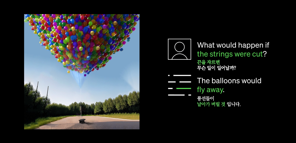 위에 보이는 이미지는 멀티모달 방식과 향상된 인지 능력을 한 번에 강조하는 내용을 보여줍니다. GPT-4에게 무게추에 매달린 풍선 사진과 함께 '끈을 자르면 어떤 일이 벌어질까?'라고 묻자 풍선이 날아가버린다고 답변했다고 합니다. 이미지가 나타내는 상황을 인지하는 능력과 물리법칙을 고려하는 추론 능력까지 크게 향상되었다는 것을 알 수 있었습니다.